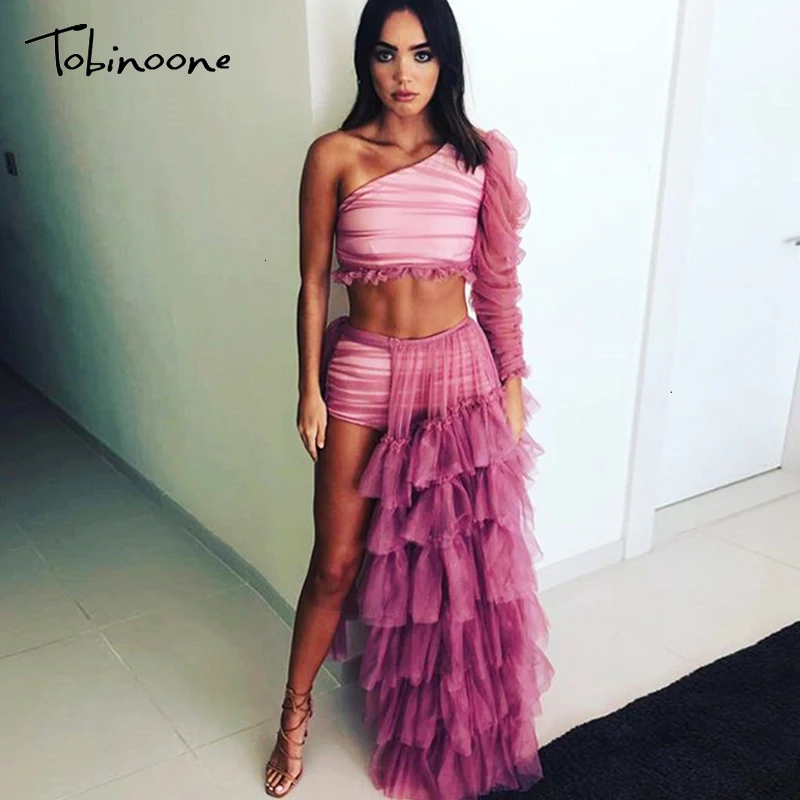 HOT SALE Tobinoone Ruffles Sexy Party Dress Vestidos High Side Split Bodycon Maxi Dress Women One Shoulder M