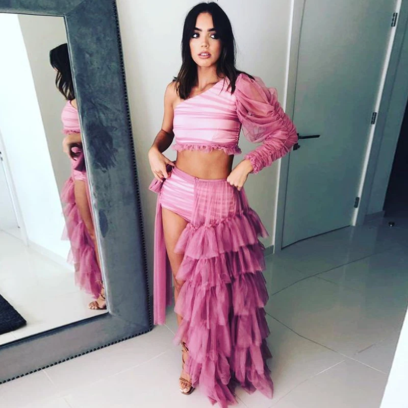 HIGH QUALITY Tobinoone Ruffles Sexy Party Dress Vestidos High Side Split Bodycon Maxi Dress Women One Shoulder M