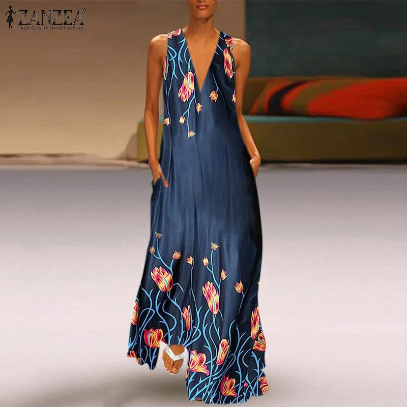 TOP 2020 Summer ZANZEA Bohemian Dress Women Sexy Deep V Neck Long Maxi Vestidos Party Dresses Casual Po