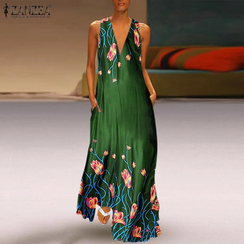 2020 Summer ZANZEA Bohemian Dress Women Sexy Deep V Neck Long Maxi Vestidos Party Dresses Casual Po